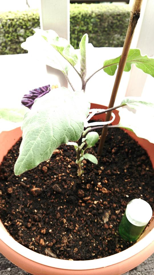 長ナスも二鉢とも、第一果がすでにスクスクと成長しております。