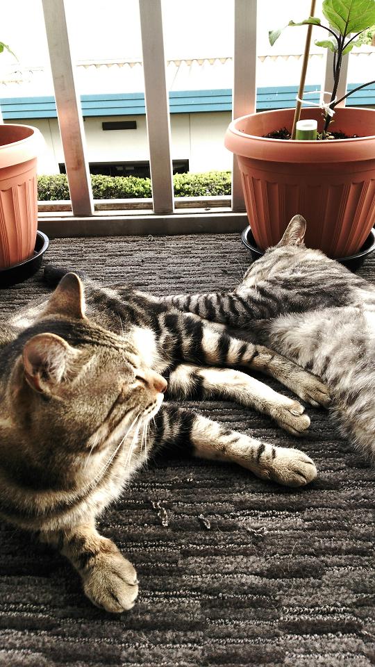 屋根上脱走常習犯の兄弟2匹。部屋に入ればいいのに、わざわざクソ暑いベランダで伸びてます。
