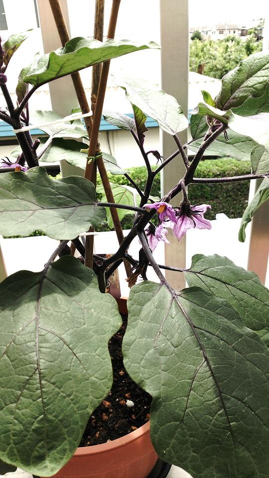 普通の長茄子に比べ、株は一回り小さいのに花だけはやたら咲いてます…。